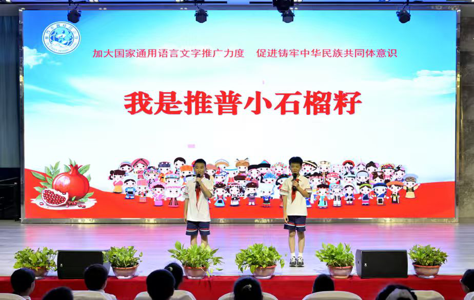 五一路小学率先发力,德育主任在国旗下发表《筑梦强国音 普语铸基石》讲话,阐明推广国家通用语言文字对增进各民族交往交流交融、铸牢中华民族共同体意识的重要性。各班随后开展“推广普通话,经典润童心”主题班会,经典诵读、绕口令比赛、错别字纠错等活动轮番上演,学生在欢乐中感受中国文字的魅力,体悟民族团结内涵,优秀语言文字作品的集中展示更添文化氛围。