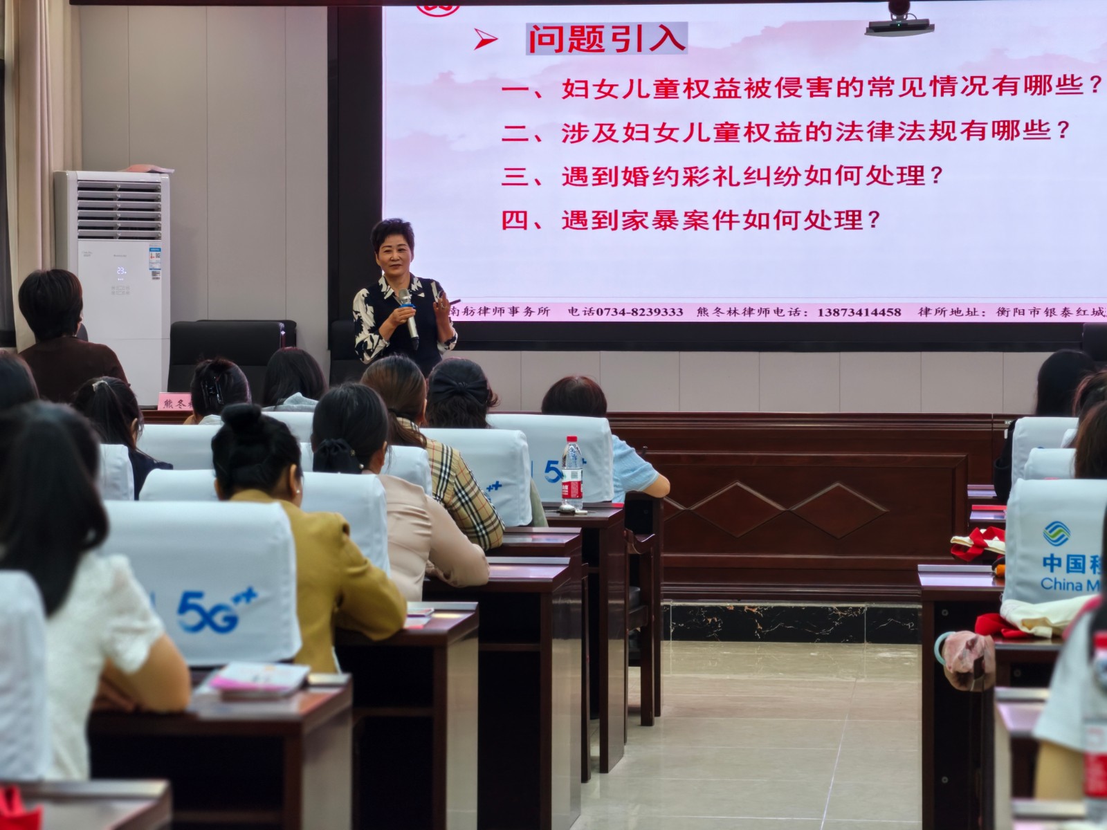 培训首课由湖南南舫律师事务所副主任、市律师行业妇联主席熊冬林主讲。她以《筑牢维权根基 守护妇童权益》为题,围绕婚姻财产、性侵、家暴等现实问题,结合《民法典》《妇女权益保障法》等法律法规,通过真实案例剖析和现场互动,层层深入,帮助学员夯实依法维权的基础。随后,戴金哲法官带来题为《维护社会稳定 促进家庭和谐》的课程。他结合多年家事审判与调解经验,为学员处理婚姻家庭纠纷提供了新思路和实用方法。