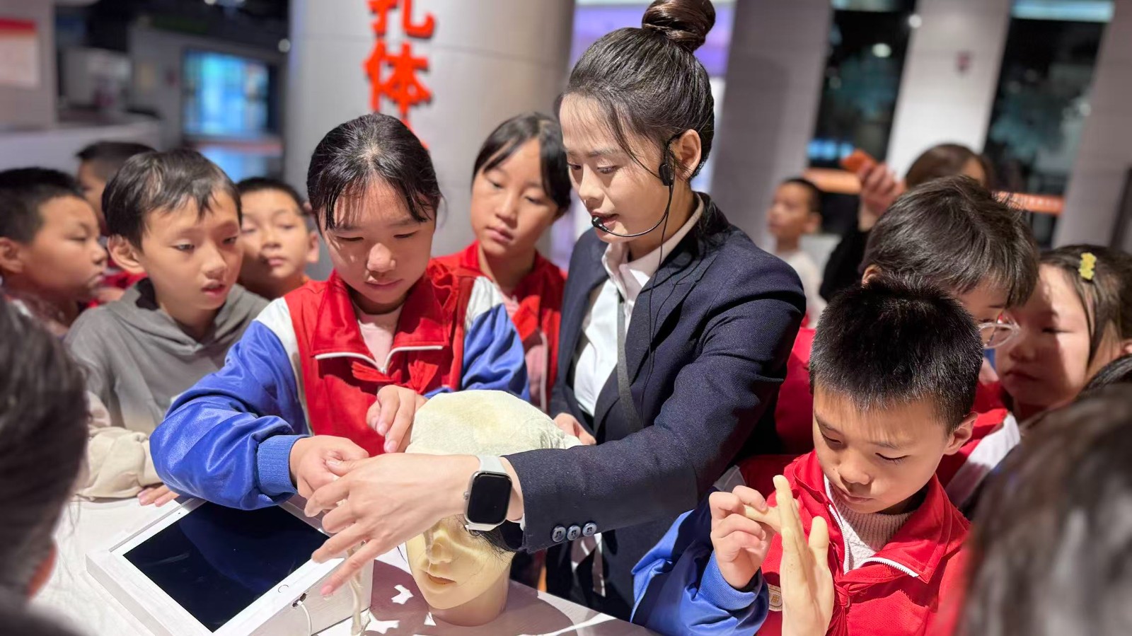 走进科普馆,丰富多元的展示形式让防空防灾知识变得生动有趣。科普文字、图板图像、音响影视、实物模型与多媒体互动装置协同发力,将抽象的安全知识转化为直观体验。同学们驻足观察、聆听讲解,了解人防知识的重要性和实用性。师生们在地震和火灾的模拟场景中沉浸式学习逃生技巧;在讲解员的悉心教导下学习心肺复苏技能;在互动体验中熟练掌握急救包扎的方法。每个同学都非常认真,现场学习氛围热烈而浓厚。
