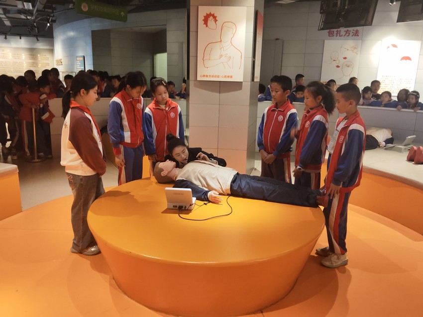 走进科普馆,丰富多元的展示形式让防空防灾知识变得生动有趣。科普文字、图板图像、音响影视、实物模型与多媒体互动装置协同发力,将抽象的安全知识转化为直观体验。同学们驻足观察、聆听讲解,了解人防知识的重要性和实用性。师生们在地震和火灾的模拟场景中沉浸式学习逃生技巧;在讲解员的悉心教导下学习心肺复苏技能;在互动体验中熟练掌握急救包扎的方法。每个同学都非常认真,现场学习氛围热烈而浓厚。