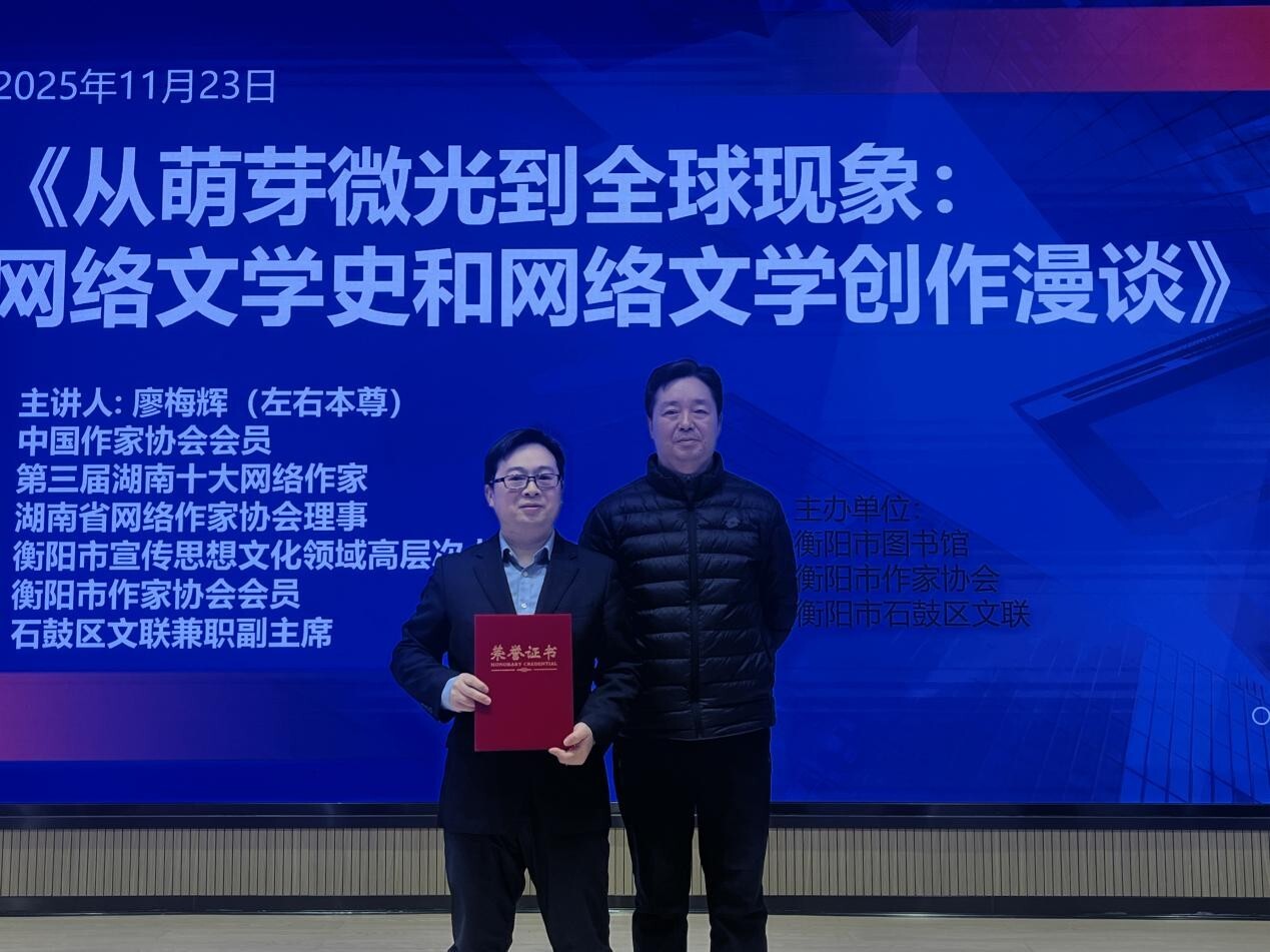 11月23日,“书页间·与作家面对面”第二期活动在衡阳市图书馆一楼多功能报告厅举行,知名网络作家廖梅辉(笔名:左右本尊)受邀担任主讲嘉宾,200余位市民读者齐聚一堂,共赴一场兼具深度与温度的文学交流盛宴。本次活动由衡阳市图书馆、衡阳市作家协会、石鼓区文联共同主办。