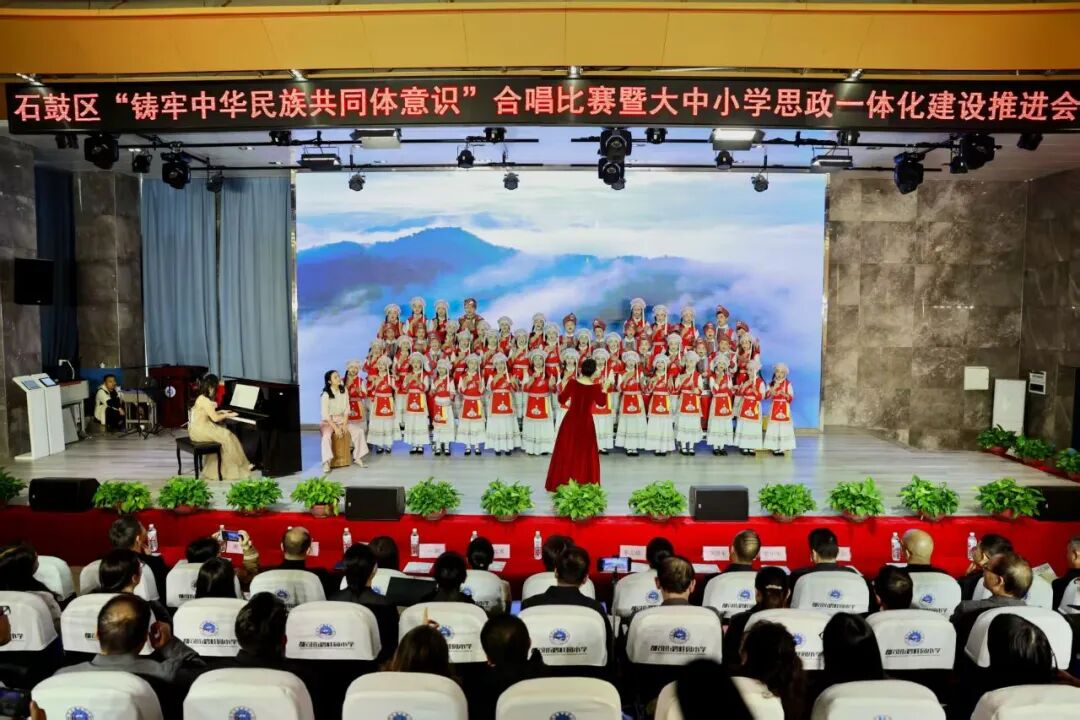 随后,活动的重头戏——石鼓区中小学第二届“铸牢中华民族共同体意识”合唱比赛精彩上演。全区各中小学合唱团轮番登台,用歌声诠释对中华民族共同体的深刻理解与热爱。各校合唱团精神饱满、歌声嘹亮、情感真挚,为现场观众献上了一场精彩纷呈的视听盛宴。