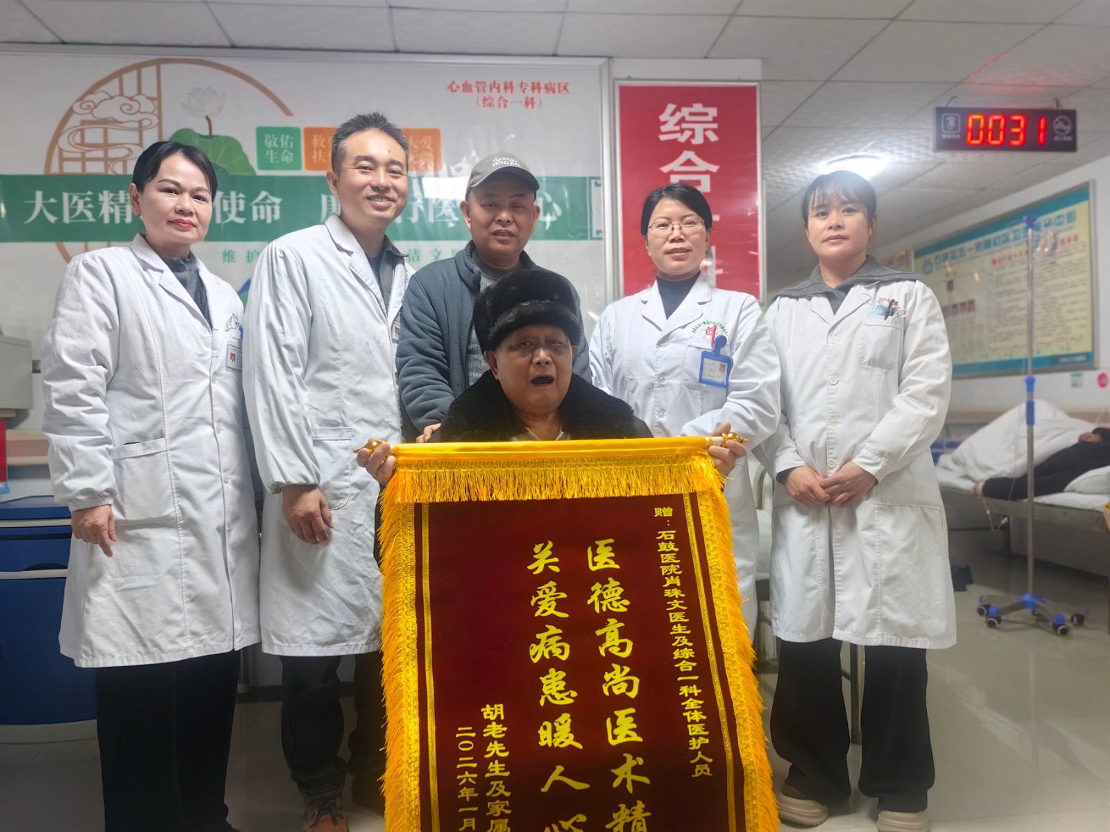 “感谢你们让我父亲获得重生!”近日在石鼓区石鼓医院综合一科上演了温馨的一幕,患者的儿子给该科主任肖珠文送来一面写有“医德高尚医术精,关爱病患暖人心”的锦旗,感谢综合一科全体医护人员对老人的精心救治及暖心关怀。