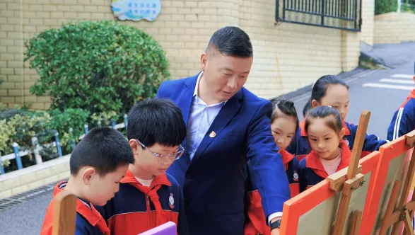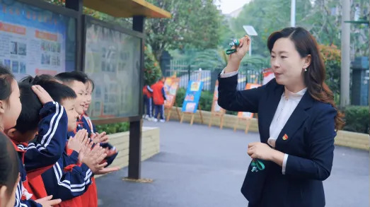 “我爱祖国,也爱每一个民族的兄弟姐妹。”一年级学生蒋抒橙指着书包上那颗小小的“五一君宝”挂饰开心地说。“五一君宝”正是学校为每一位新生准备的入学礼物,寓意“以君子之德立身,以石榴之籽同心”。每学期开学,校长都会亲自为新生佩戴君宝挂饰,讲述其背后“仁爱、团结、阳光、力行”的精神内涵。